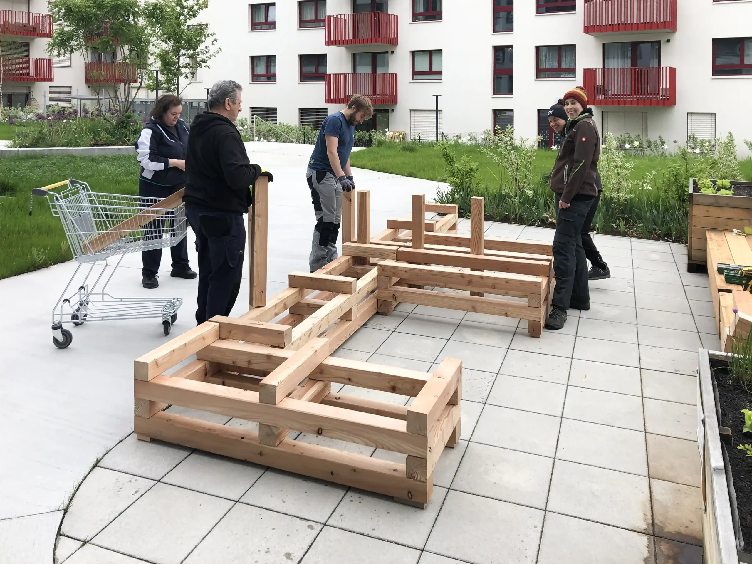 Der Aufbau der Außenmöbel erfolgte wieder im Rahmen einer Mitmachaktion mit freiwilligen Anrainern. Diese gemeinschaftliche Montage stärkte nicht nur das Zusammengehörigkeitsgefühl, sondern sorgte auch dafür, dass sich die Teilnehmenden mit „ihren“ Möbeln identifizieren.