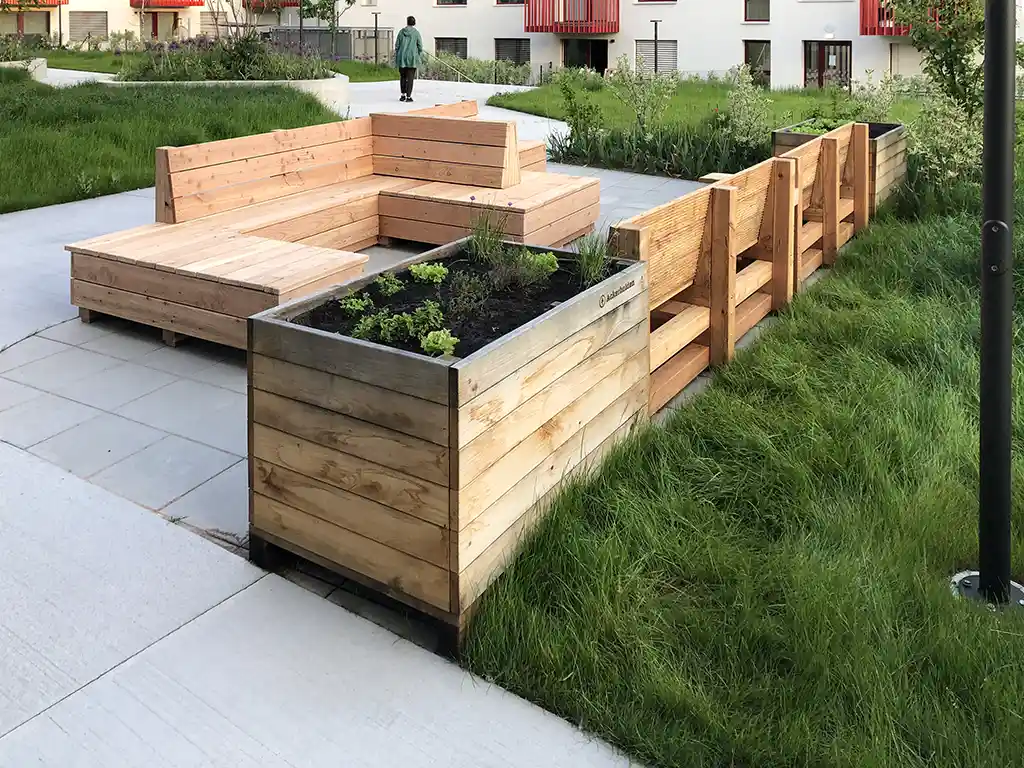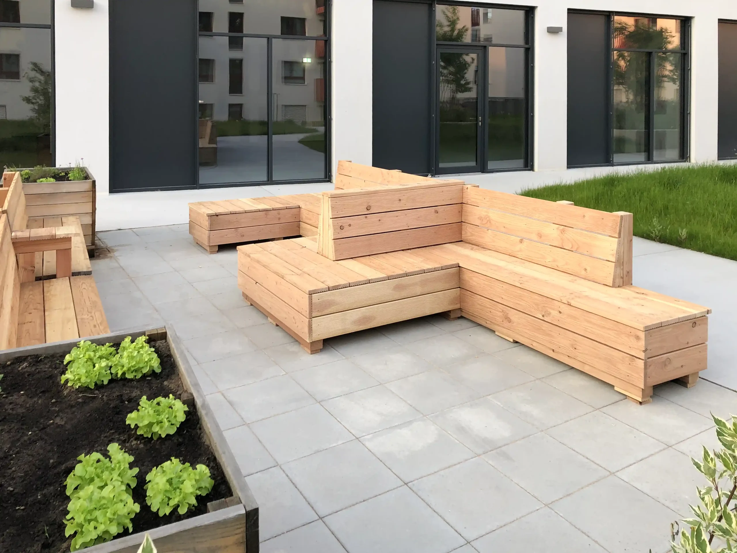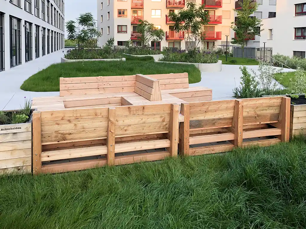 Das Herzstück des Projekts bildet eine inselartige Sitzgelegenheit, die von Hochbeeten umgeben ist und sich harmonisch in die Gewerbehofterrasse einfügt. Die Möbellandschaft schafft unterschiedliche Aufenthaltsmöglichkeiten und lädt zum Verweilen ein.