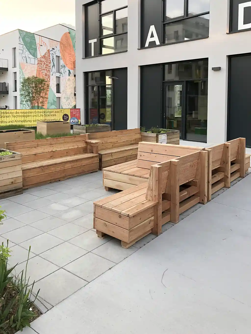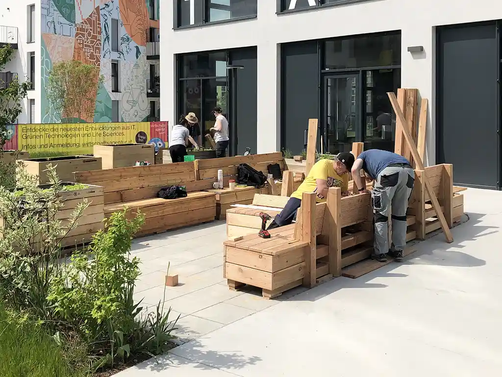 Im Jahr 2022 entstand im Rahmen einer Mitmachbaustelle beim Gewerbehof Seestadt ein besonderes Projekt: Maßgefertigte Außenmöbel, die als Treffpunkt und Begegnungsort für Gewerbetreibende und Anrainer dienen. Das Projekt zeigt beispielhaft, wie partizipatives Design und gemeinschaftliches Bauen urbane Räume beleben können.