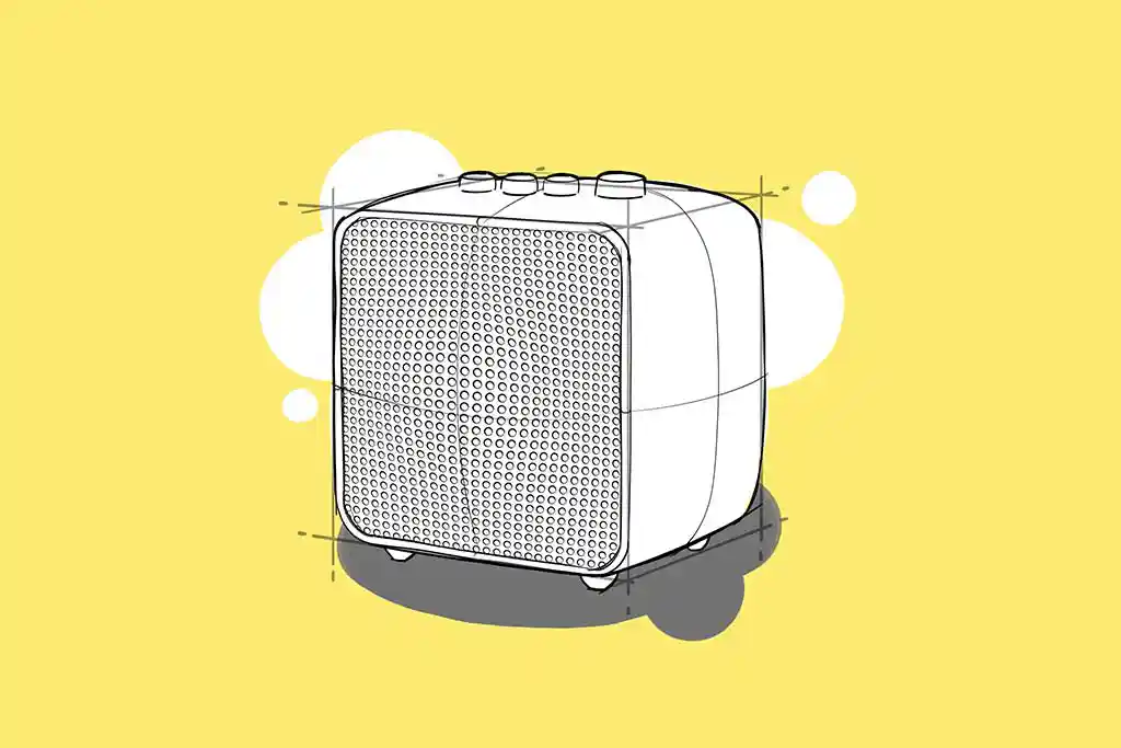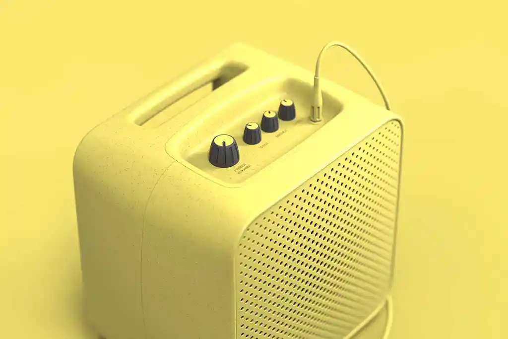 Industriedesign eines E-Bass Gitarrenverstärker der sich durch sein freundliches und nicht technisches Design von anderen auf dem Markt unterscheidet.
